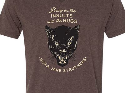 V-neck Next Level 60/40 cotton/poly blend shirt in espresso with "Bring on the insults and the hugs" cougar design.
